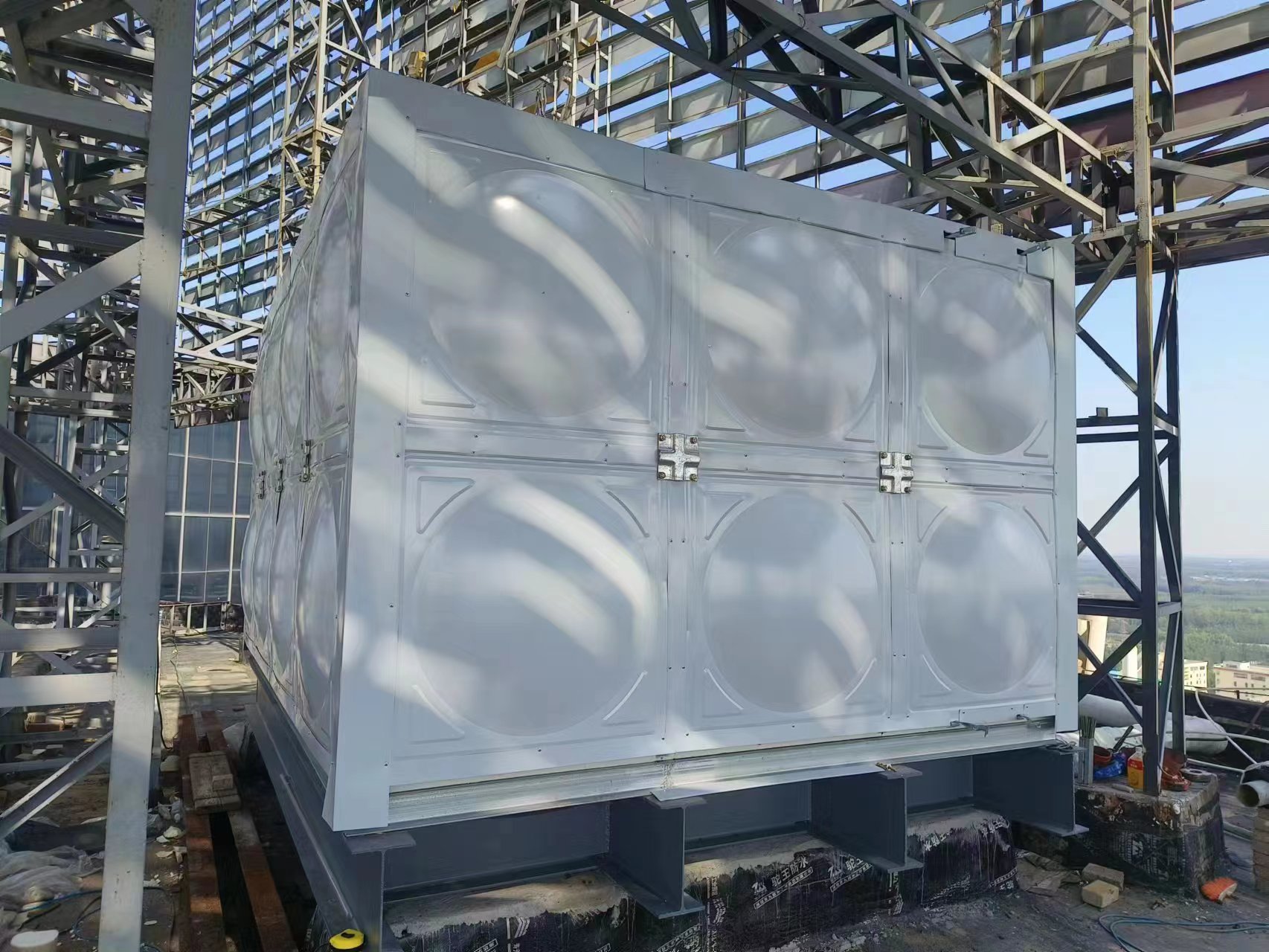 我公司承接的山東德州24立方玻璃鋼保溫水箱已經(jīng)安裝試水完成,此次水箱安裝在屋頂,用做消防水箱使用。當(dāng)?shù)囟緶囟容^低,防止上凍,在水箱外層采用的是10公分聚氨酯加彩鋼板保溫。