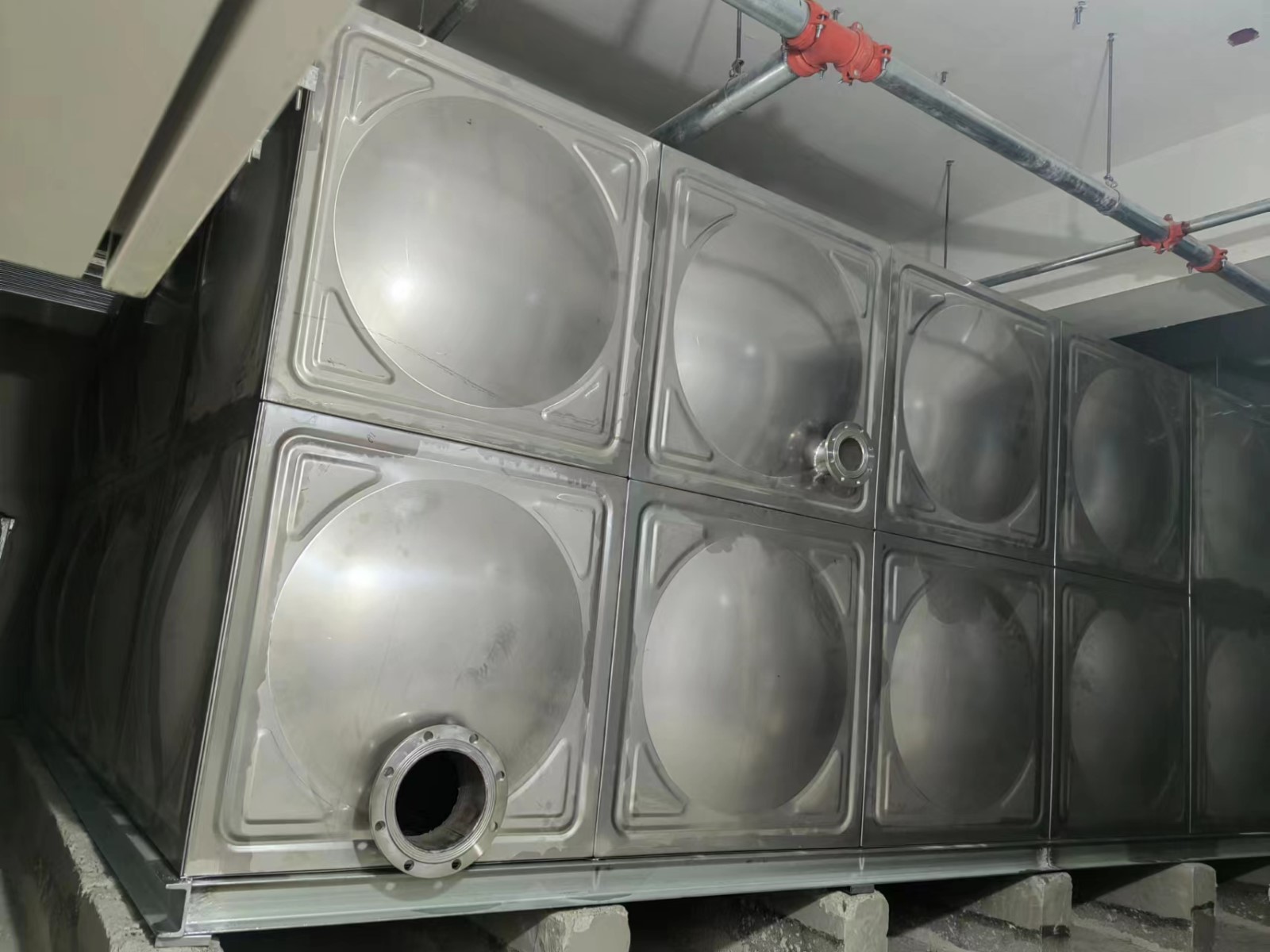 我司承接的北京市大興區(qū)舊宮合生項目,不銹鋼生活給水及中水水箱,已安裝試水完畢。不銹鋼焊接水箱,是指容器本體用不銹鋼板沖壓帶一定凹凸形狀,使之鋼度大大提高,再焊接成薄殼箱體的新型水箱,是目前國內較先進、較美觀、較適用的水箱,其結構精巧、合理、先進,用材省,可在民用及工業(yè)建筑中廣泛采用,是儲存、調節(jié)用水的理想設備。