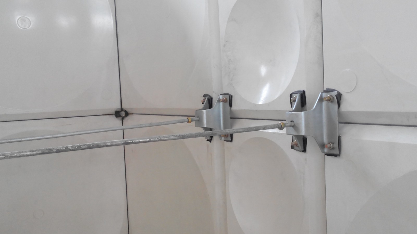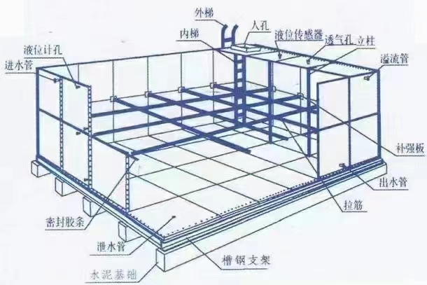 其次安裝各邦,根據水箱單板上的印號及說明,找出水箱邦體的各層邦號,并且預先分開,用螺栓組裝邦體。把水箱板立好,找正,使邦板與底邦形成90度夾角,并且加密封膠條,緊固螺栓。然后安裝內拉筋,內拉筋根據水箱尺寸,找對拉筋的數量及長度。用拉筋板測量拉筋對絲緊固部位,畫印、打眼、上對絲緊固,使拉筋平整的與水箱箱體保持平衡。如箱體與拉筋之間有較大誤差,可通過調整螺栓緊固程度來調整誤差大小,直到把誤差調整到合適為止。